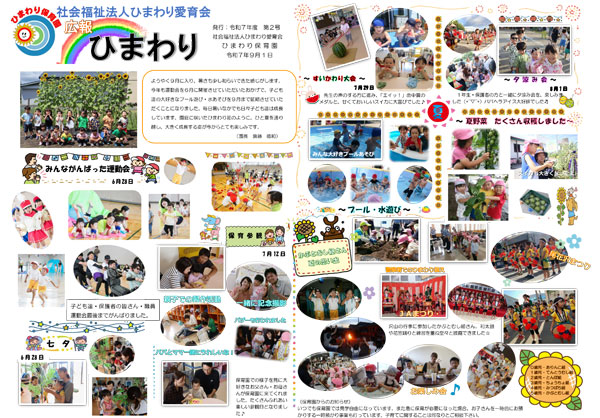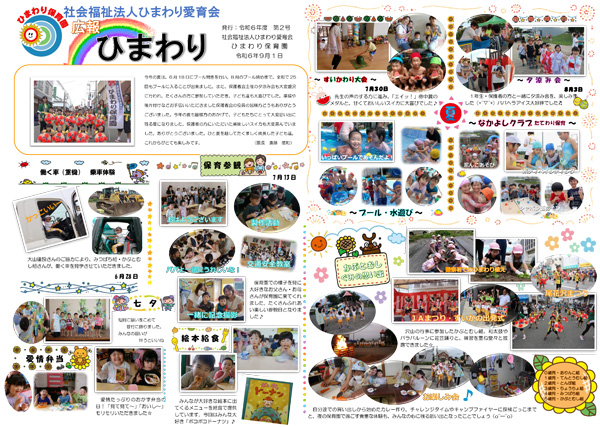 「今日プールは?」「まるー」毎日子ども達との何気ない会話。今年の夏は、猛暑が続き、子ども達が大好きなプール遊びも予定を伸ばし行いました。また今年は、ひまわり保育園の夏のビックイベント夏祭り「夕涼み会」を4年ぶりに園庭で、ご家族の方々と一緒に行い、楽しい時間を過ごすことができました。